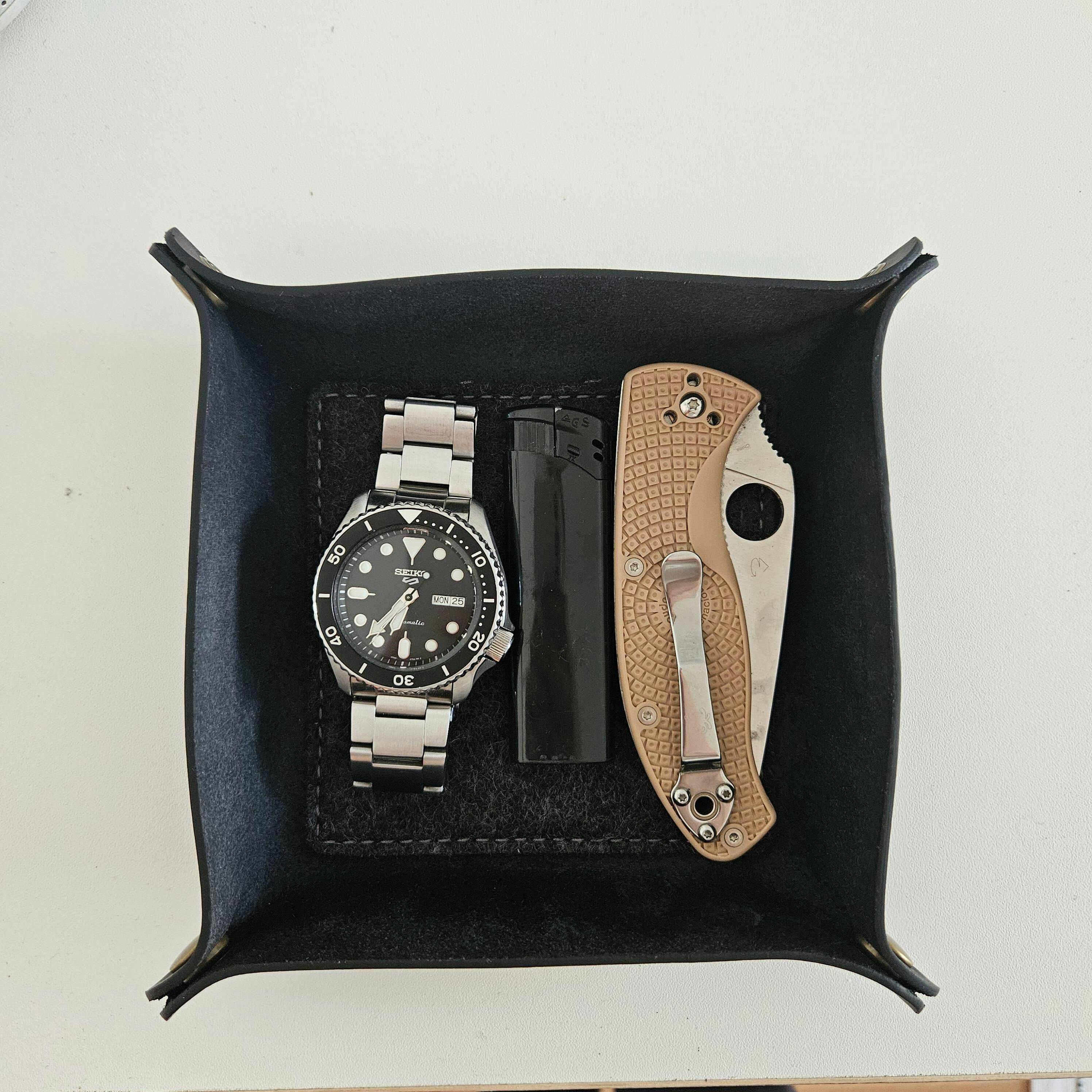 Looking for an elegant and reliable way to organize your items? Our valet tray is here to help! Handmade in our studio of natural premium quality Vegetable-Tanned Italian leather, providing superior craftsmanship and stylish appearance. With multiple leather colors available, you can be sure you'll find the perfect shade to match your style. Keep your workspace tidy, organized, and cozy.